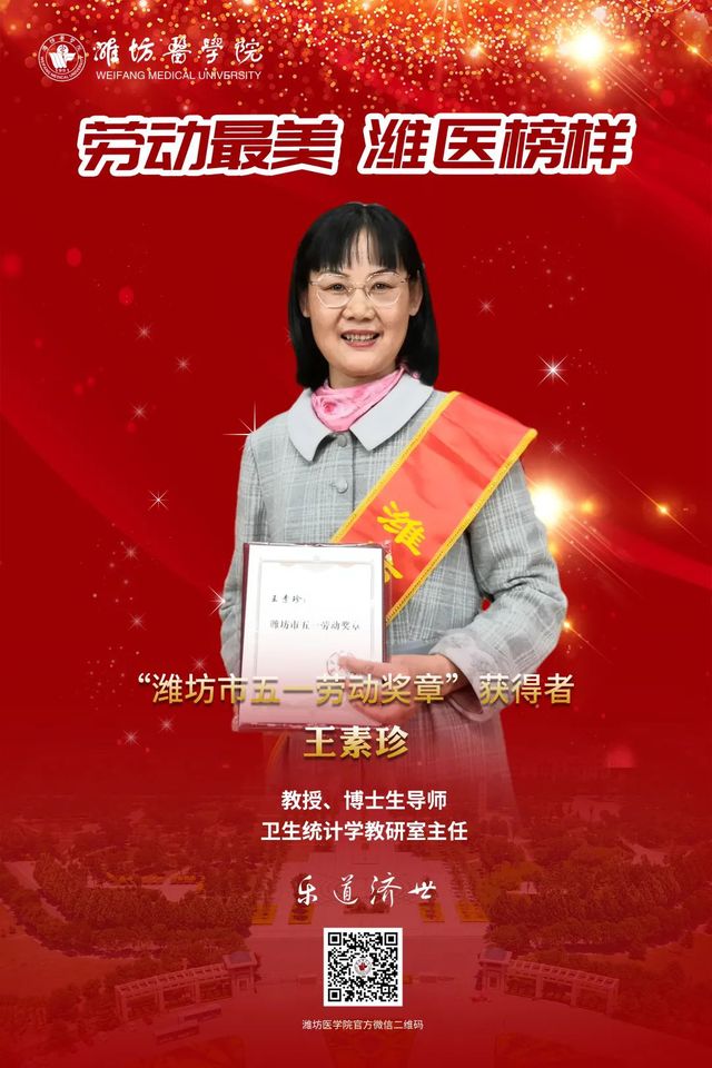 公共卫生学院卫生统计学教研室主任王素珍教授和附属医院医务部主任、重症医学科主任张培荣教授双双荣获“潍坊市五一劳动奖章”荣誉称号。